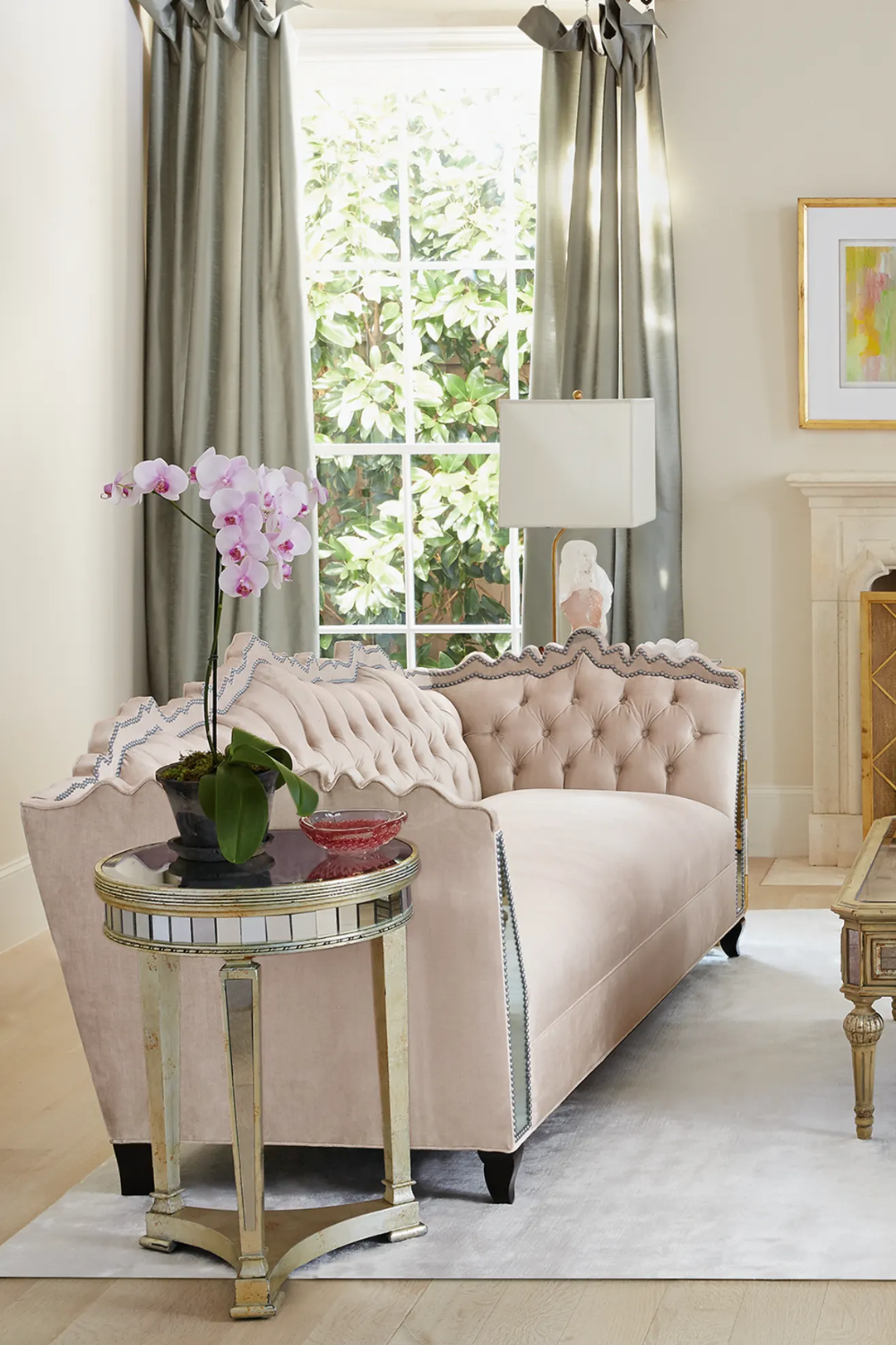 Plush cushioning and tailored upholstery provide both comfort and visual impact, while the mirrored inset trim along the arms adds a dramatic, couture-inspired detail. This handcrafted blush sofa pairs classic design with glamorous accents, making it ideal for curated interiors that favor soft color palettes and elevated materials.
