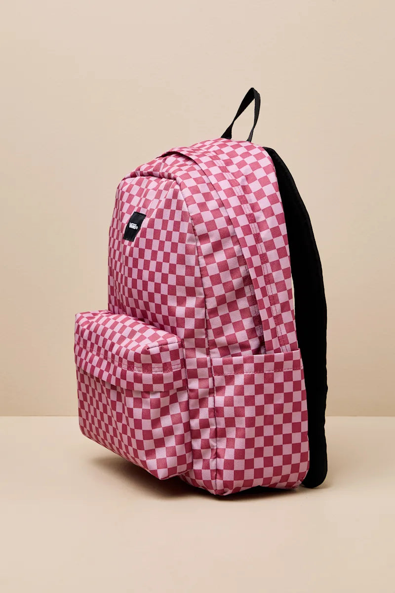 The Vans Old Skool Mauvewood Pink Checkered Backpack features the brand's iconic checkerboard pattern in a soft pink colorway. Designed for everyday use, this backpack includes a spacious main compartment, front zip pocket, and adjustable shoulder straps for comfortable carrying.