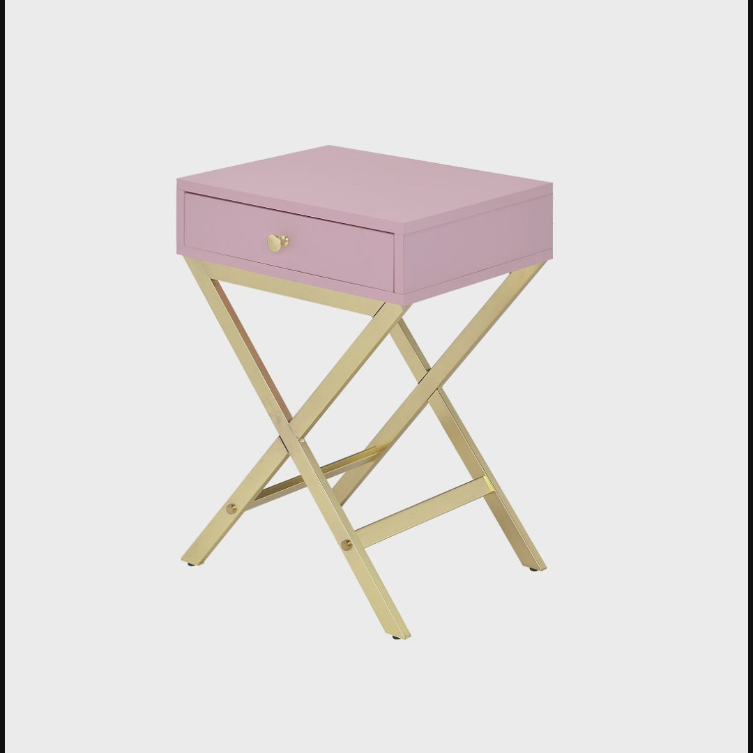 This pink and gold accent table is a compact 16-inch side table designed for living rooms, bedrooms, or small spaces. It features a soft pink tabletop with a gold-finished metal base and a built-in drawer for convenient storage.