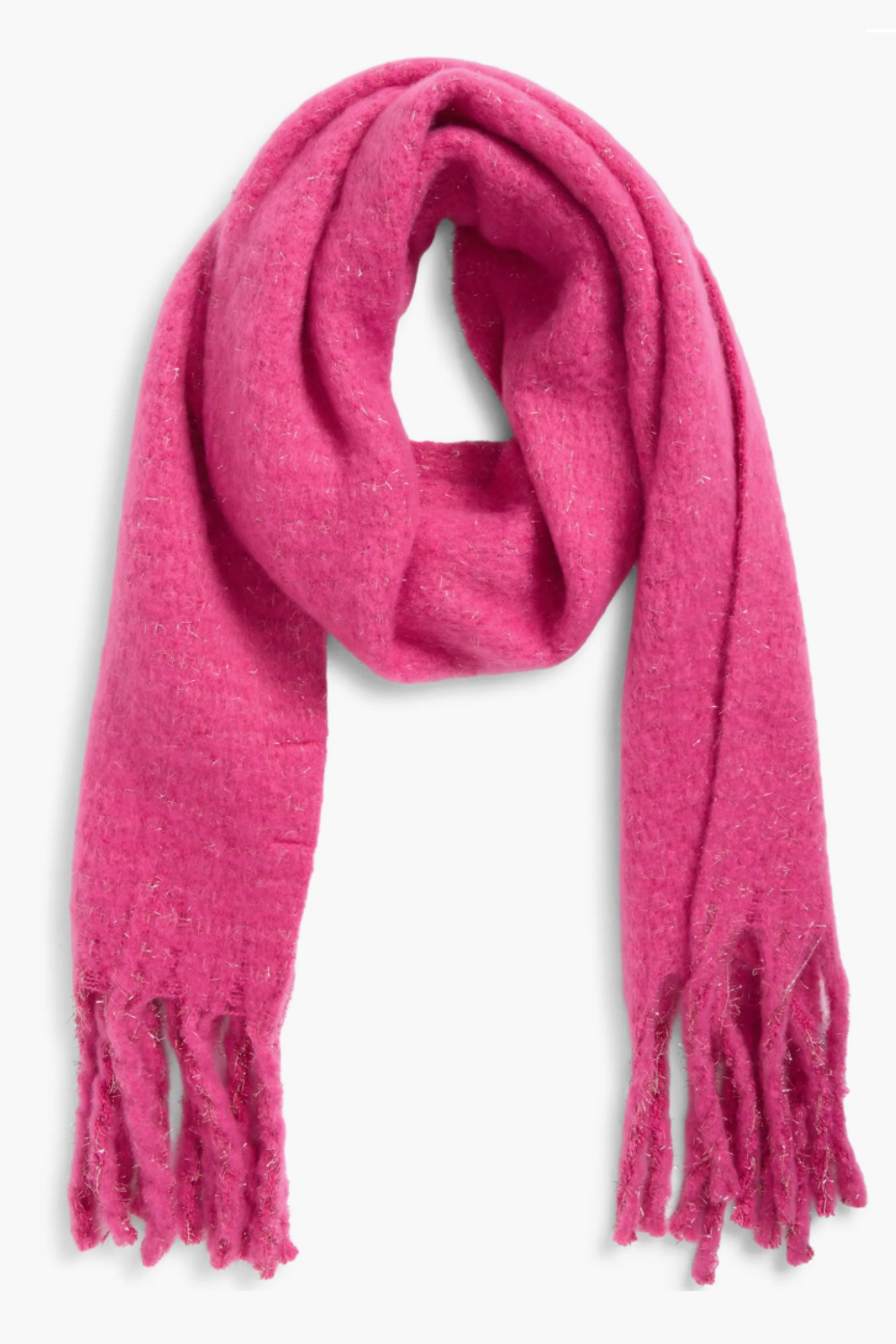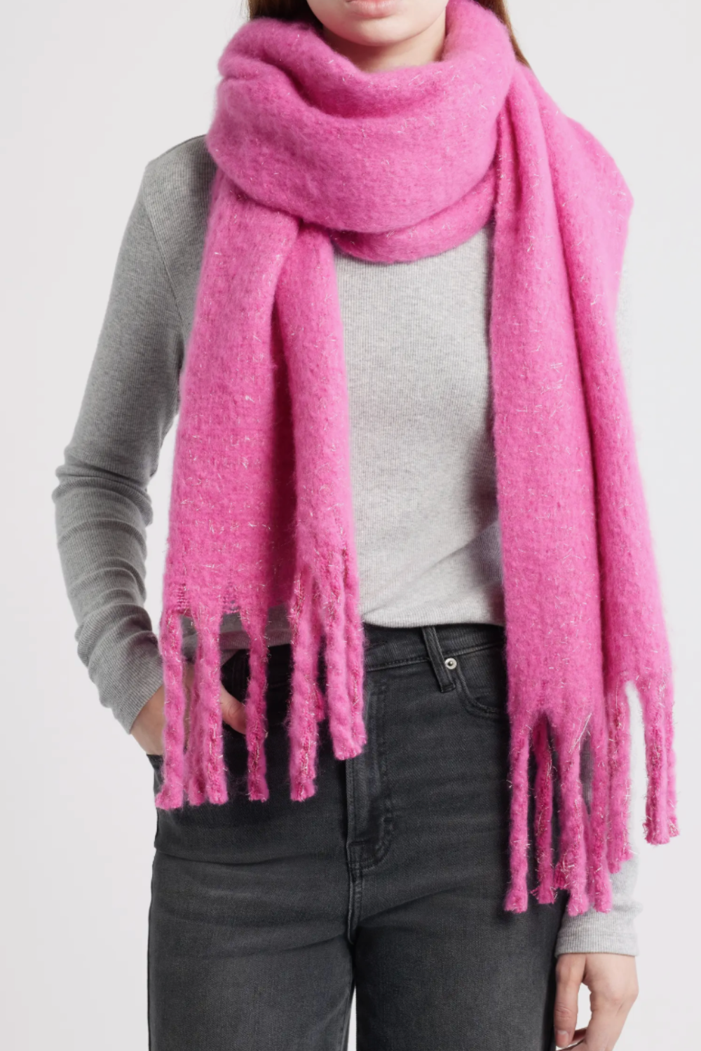 A soft pink cozy sparkle fringe scarf designed for everyday warmth with a subtle shimmer. This classic winter scarf features delicate sparkle details and fringe edges, making it easy to style with coats, sweaters, and cold-weather outfits. A versatile accessory for casual wear, seasonal layering, and gift-giving.
